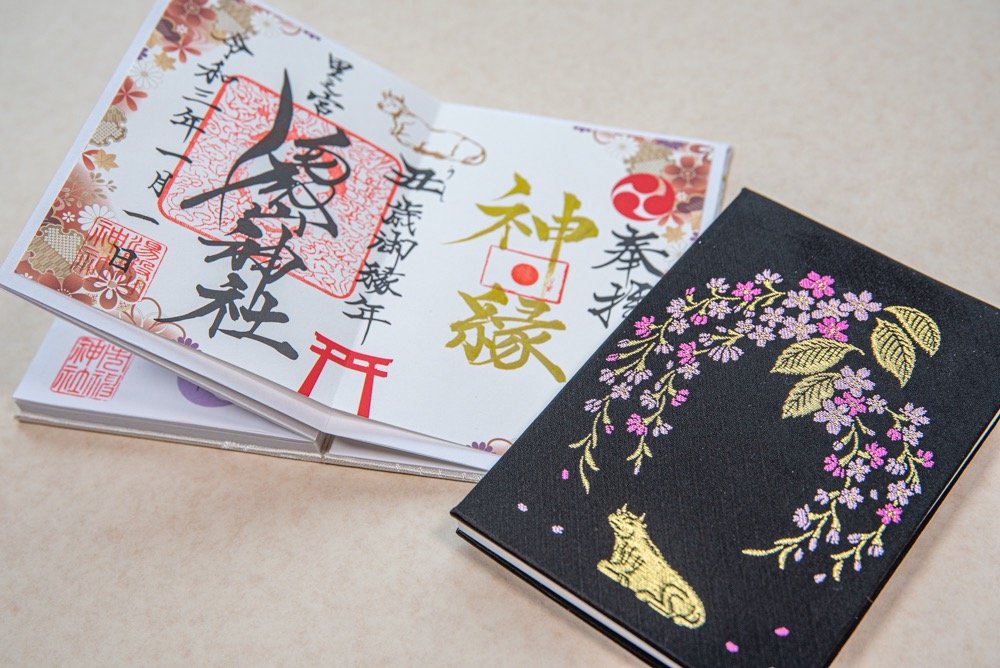 湯殿山神社オリジナルの朱印帳です。願い牛と八重桜をイメージして奉製致しました。