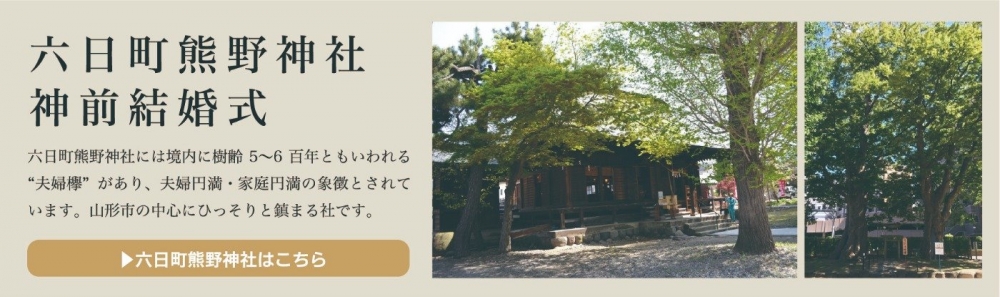 更に兼務神社の六日町熊野神社は旧山形城(現在の霞城公園)から見て、鬼門に鎮座されており、山形城の鬼門鎮護社としての約650年前に創建されたお社がございます。以後人々からは八方厄除の神として崇敬を集めております。境内に聳える樹齢約500年の夫婦欅にあやかり、夫婦円満・良縁成就の守護神として老若男女広くお参りをいただいております。