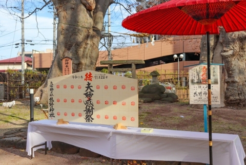 境内にございます大樹「夫婦欅」の前にて、例年11月22日【いいふうふの日】に夫婦感謝祭が斎行されます。