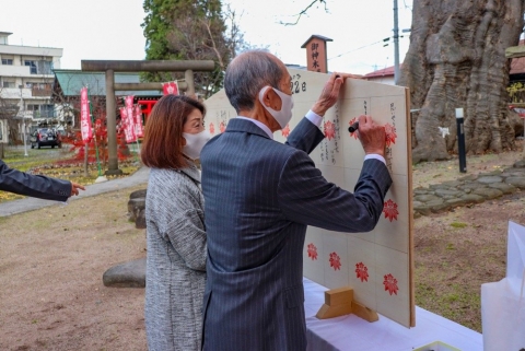 祭典後は夫婦欅の前に置かれた巨大絵馬に、日頃なかなか口にして伝えることが出来ない感謝の言葉を互いに書き込み、記念撮影などをして夫婦の絆を深めあいます。
