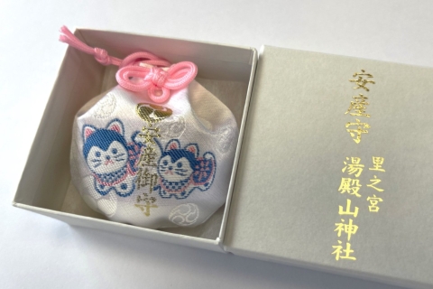 箱入り巾着型の御守です。可愛らしい犬と毬(まり)が刺繍されています。