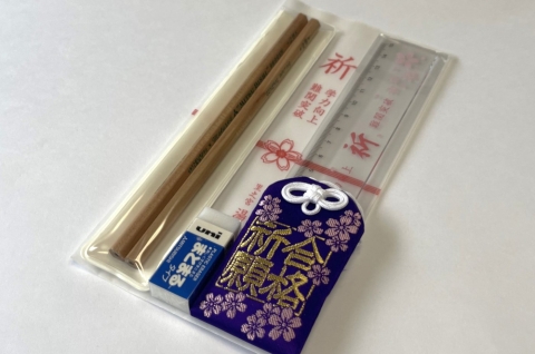 「合格袋御守」「えんぴつ」「消しゴム」「定規」の四点セットです。