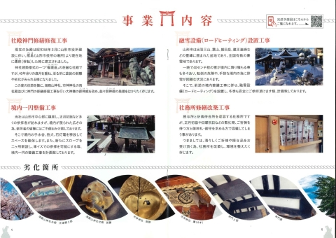 この佳年に向けて、記念事業の一環として社殿修繕や境内整備等を実施致し、参拝環境をより良くし、県都山形の鎮守社として永く後世に伝えるべく、工事を進めているところでございます。
